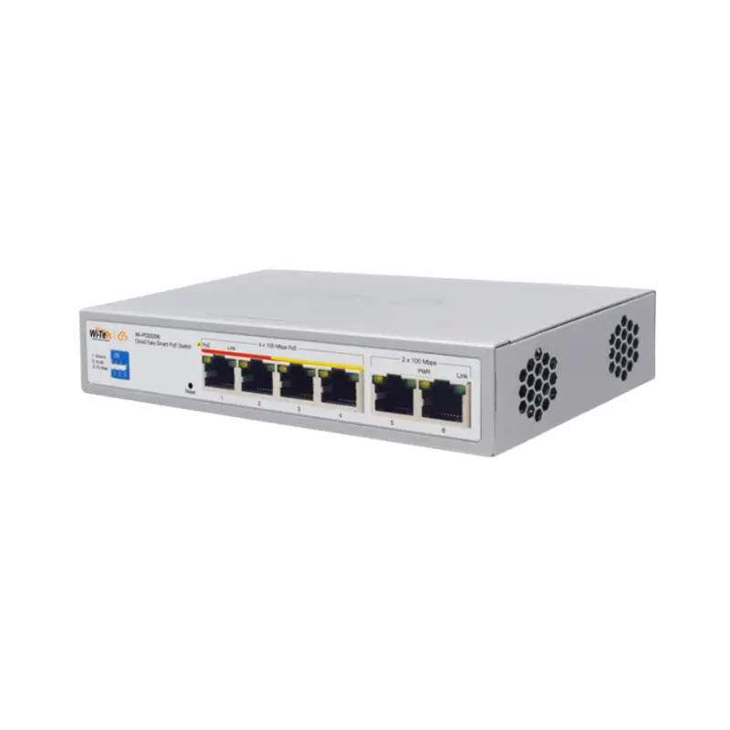 4-port PoE switch + + 2 x uplink ports. 4 x 10/100 Base-T(PoE power), each output up to 15W, Total up to 60W, 2 x 10/100 Base-T uplink, PoE protocol: IEEE802.3af, IEEE802.3at, power supply 230V AC